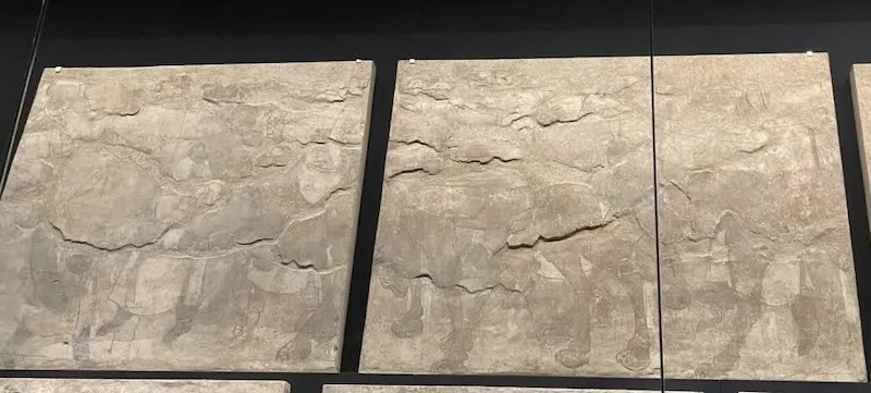 在这一组绘画中,隐藏着一匹网红“明星马”。这是一匹红色的马,无论从哪个角度看,它都仿若与观者对视,眼神娴静,被称作马界“蒙娜丽莎”。无论观众走在哪个方向,这匹马都能与观众进行眼神交流。这一绘画采用了平面透视的技巧,这也是当时的一种绘画技法的展现。此外,在群马之中,有一匹马前腿腾空,后腿蹬地,马尾扬起,显然是受了惊吓,竟排出一串粪便。