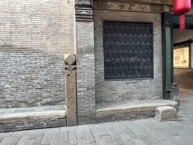 进入乔家大院大门是一条长80米的石铺甬道,把六个大院分为南北两排,西尽头处是乔家祠堂,与大门遥相对应。在大门处,人们可以看到拴马桩和上马石。张素英说,“这里的拴马桩是乔家临时拴马用的。每个院落门前没有门槛,石路平铺,也是方便马车进出。在过去,乔家门口还有个专门养马的车马院。”
