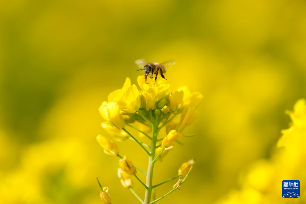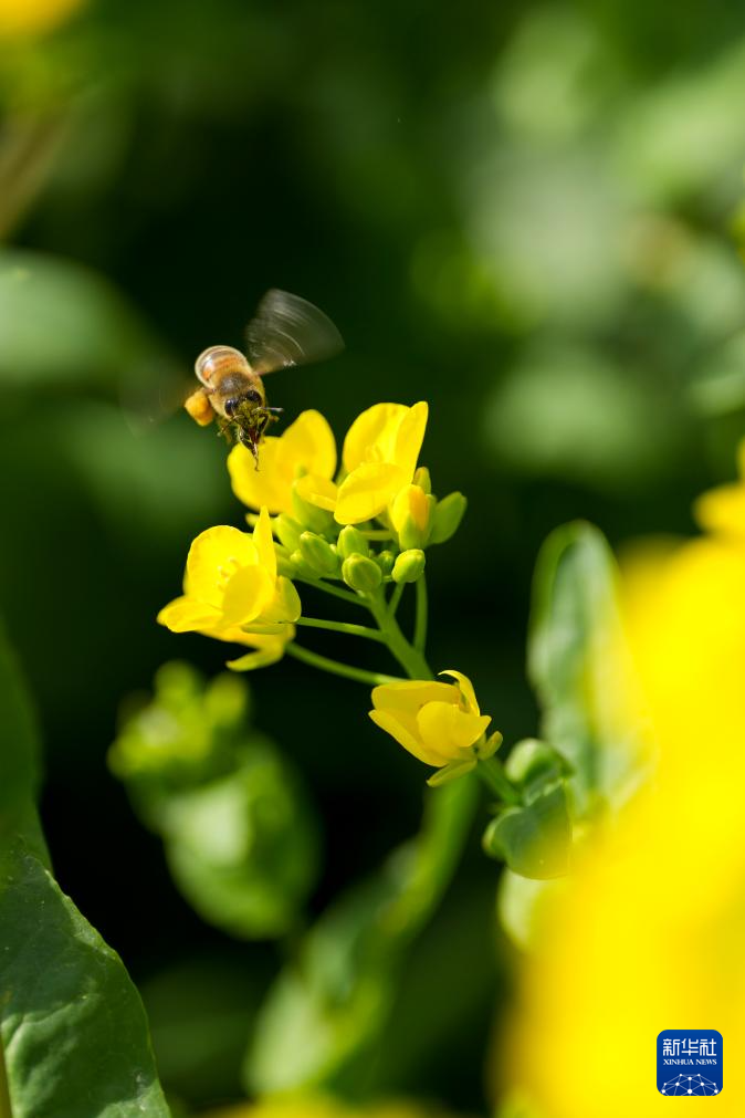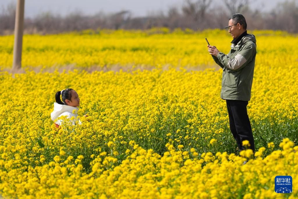 春日,山西省运城市盐湖区西姚村的油菜花竞相开放,吸引不少游客前来观赏。