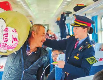 列车长张文津帮助携带大件行李的旅客。田新凯摄