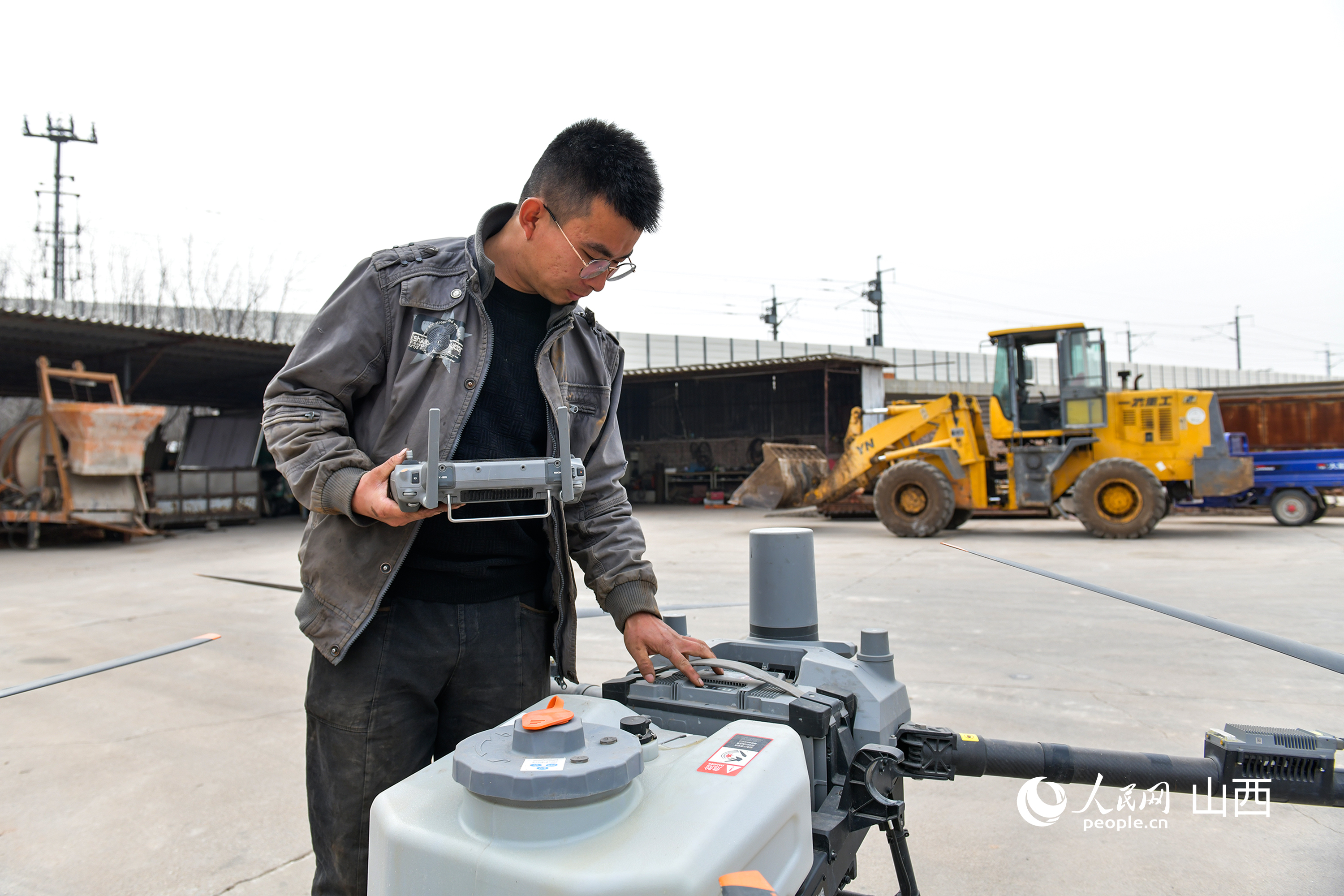 刘海忠的儿子刘禹魁调试植保无人机。人民网记者 焦搏文摄