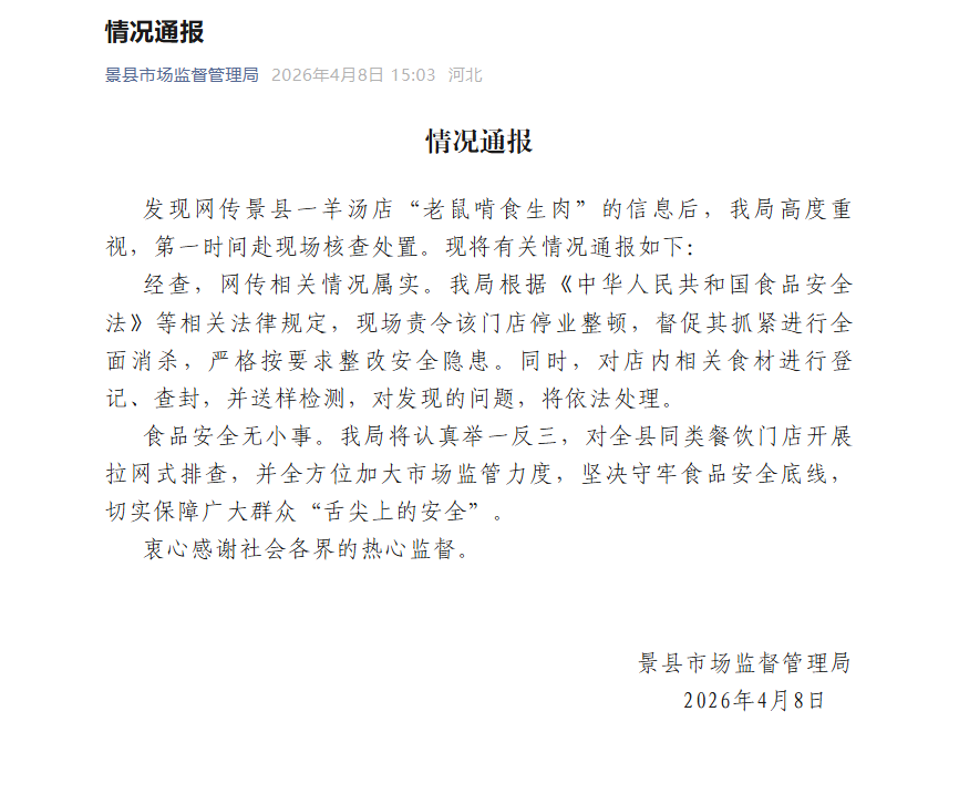 中新网4月8日电 据“景县市场监督管理局”微信公众号消息,4月8日,河北衡水景县市场监督管理局发布情况通报:发现景县一羊汤店“老鼠啃食生肉”的信息后,景县市场监督管理局高度重视,第一时间赴现场核查处置。