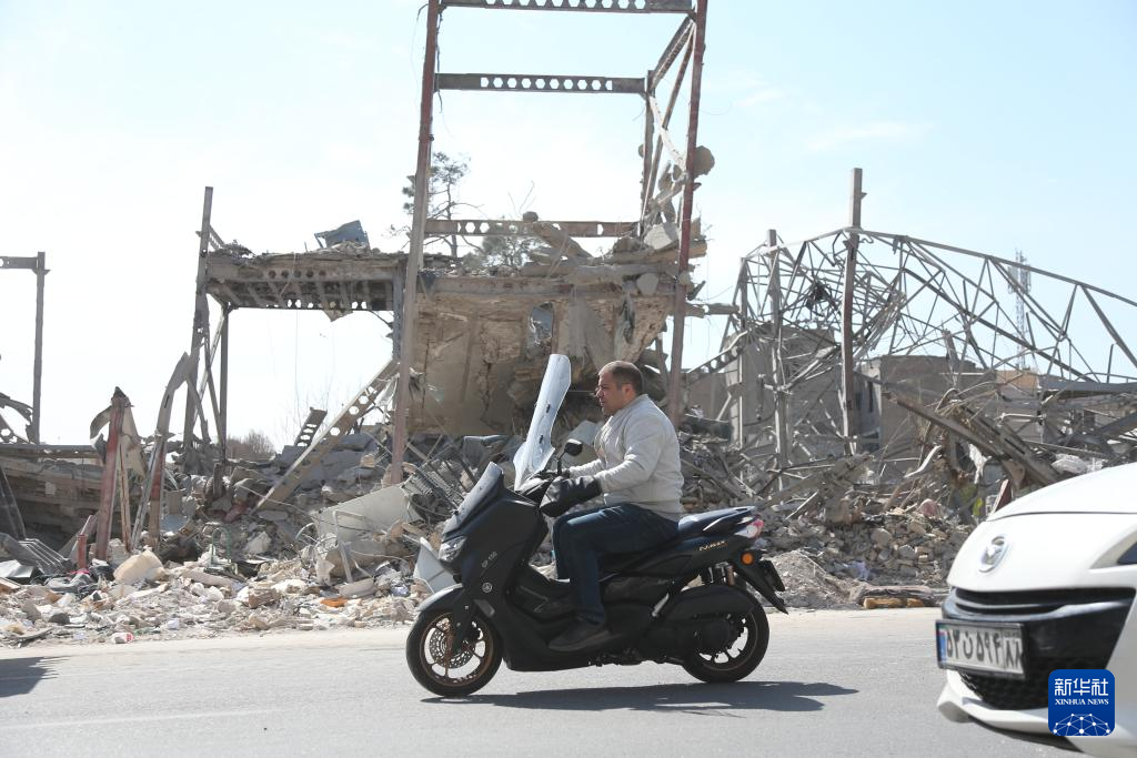 3月4日,在伊朗首都德黑兰,一名男子骑车驶过建筑废墟。