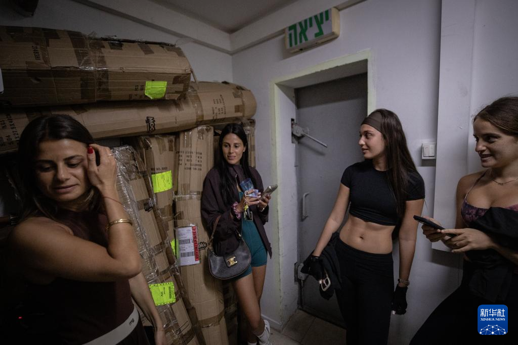 3月26日,在以色列特拉维夫,防空警报响起后,练习瑜伽的女孩们停止运动,进入社区的地下民防设施避难。