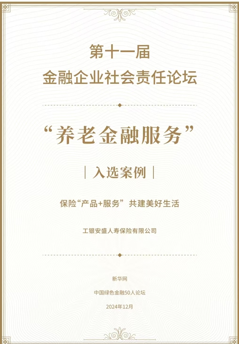 近日,由新华网主办、中国绿色金融50人论坛学术支持的第十一届金融企业社会责任论坛在北京成功举行举行。近百位相关领域领导、专家、企业家及嘉宾参会,就引领金融创新践行社会责任开展了探讨。会上,主办方还围绕科技金融、绿色金融、普惠金融、养老金融和数字金融五个方面,对外发布了“2024金融企业社会责任实践案例”。工银安盛人寿“保险‘产品+服务’共建美好生活”成功入选“养老金融服务”优秀案例。